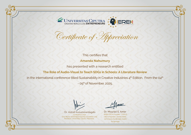 Nahumury, Amanda Putri and Nathania, Joceline and Fifkowati, Ghania Kazima (2025) The Role of Audio—Visual to Teach SDGs in Schools. In: The 4th International Conference on Sustainability in Creative Industries, 4-6 November 2025, Surabaya, Indonesia. (Unpublished)