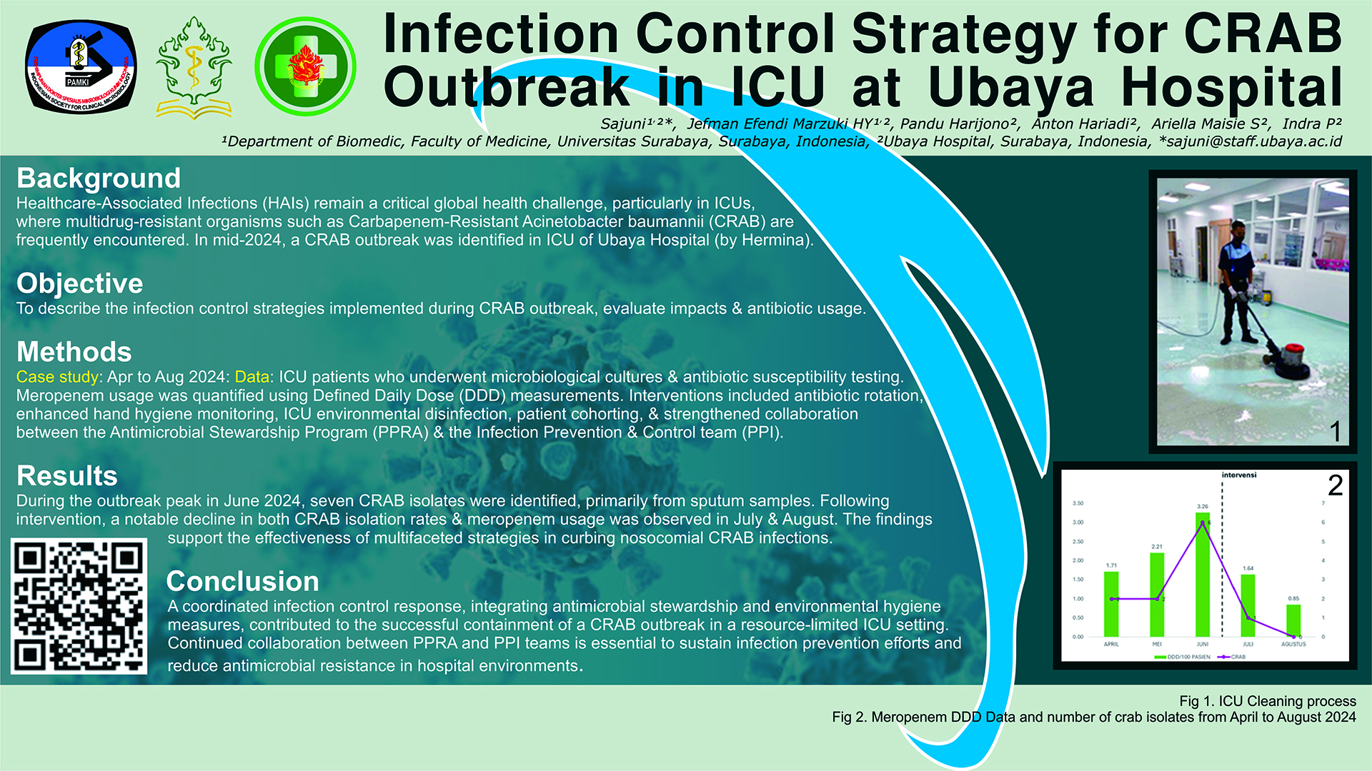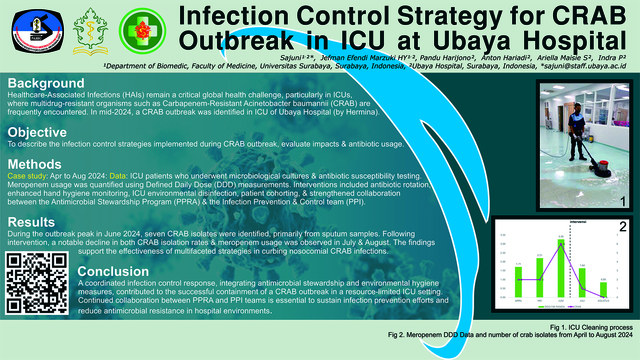 Sajuni, Sajuni and HY, Jefman Efendi Marzuki and Harjiono, Pandu and Hariadi, Anton and Sugiarto, Ariella Maisie and P, Indra (2024) Infection Control Strategy for CRAB Outbreak in ICU at Ubaya Hospital. In: Annual Scientific Meeting Pamki 2025, 23 Agustus 2025, Semarang. (Unpublished)